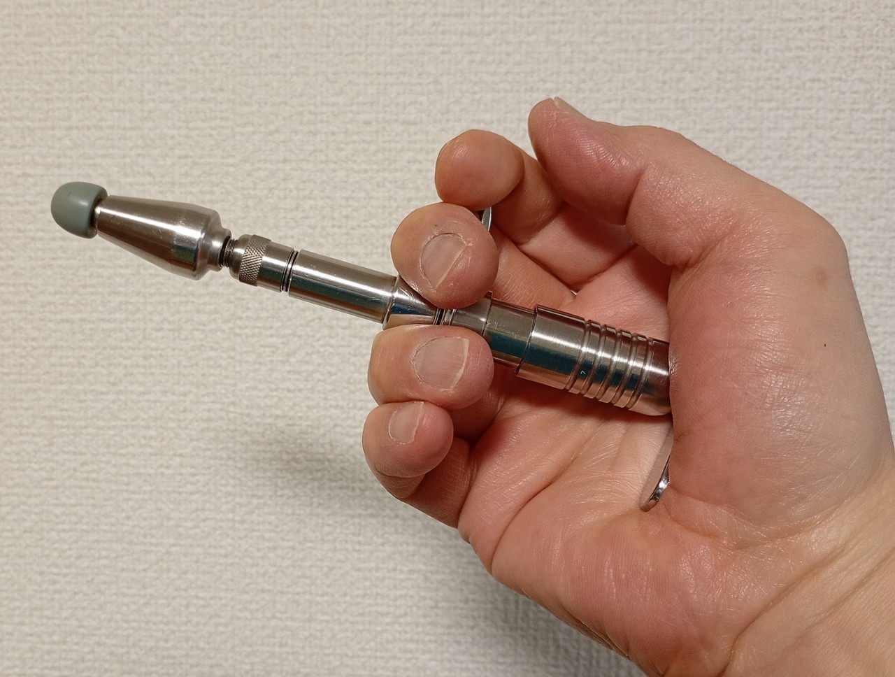 骨盤の中心にある仙骨の調整には、専用の器具(アクチベーター)を使います。